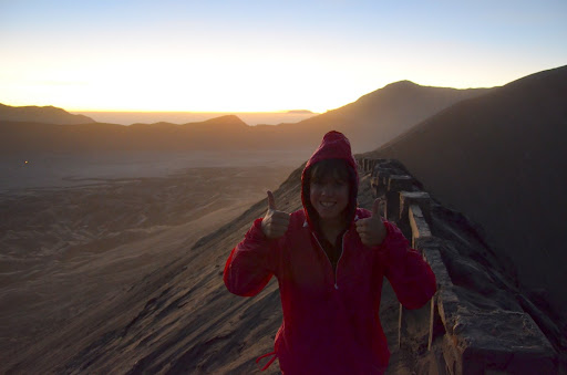 Une fois en haut c’est magnifique. De la fumée se dégage du volcan. Un petit groupe de personnes est déjà en haut à attendre que le soleil ne pointe le bout de son nez. En haut pas de trace des filles.
