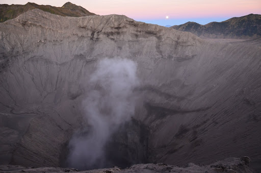 Le chemin est jonché de poussière, de creuvasses et de rochers. On galère beaucoup à trouver notre chemin mais au final on y arrive et nous commençons à monter les centaines de marches qui nous séparent du cratère. Une très forte odeur de soufre s’en dégage. On peine à respirer, on cherche son souffle et on tousse. Les vendeurs ambulants l’ont bien compris et proposent des masques en papier. On se dépêche car le jour se lève.